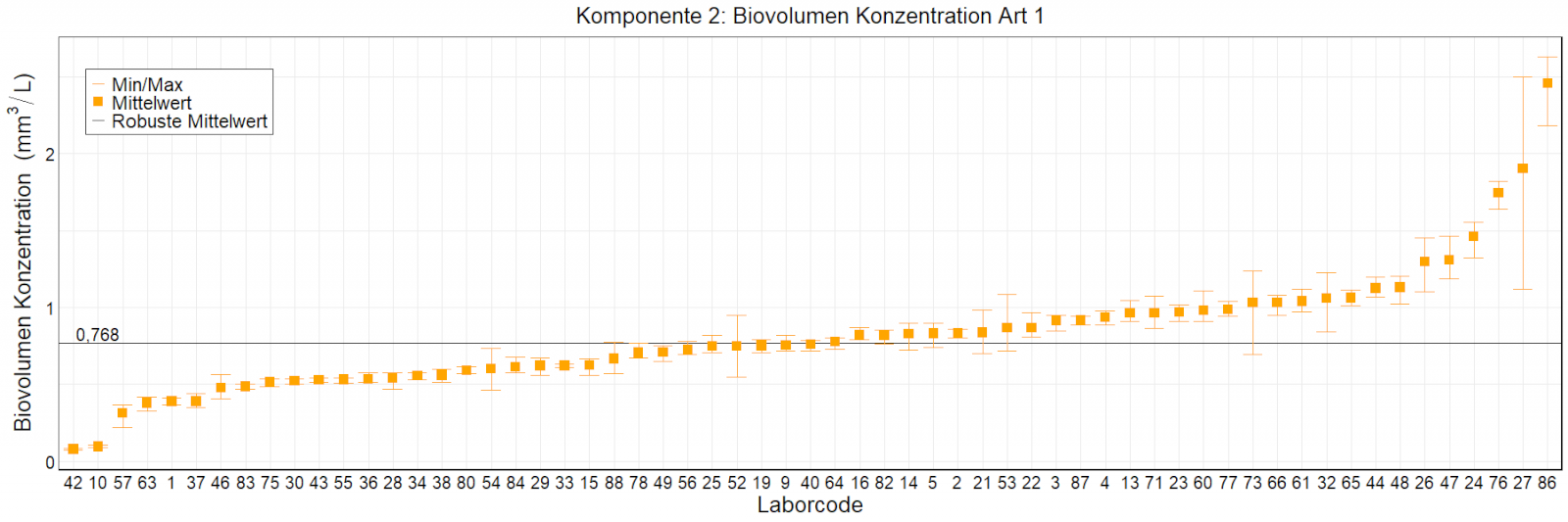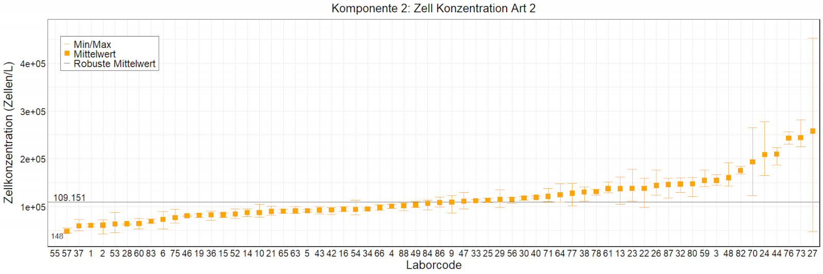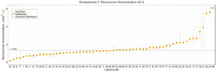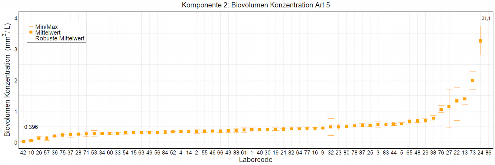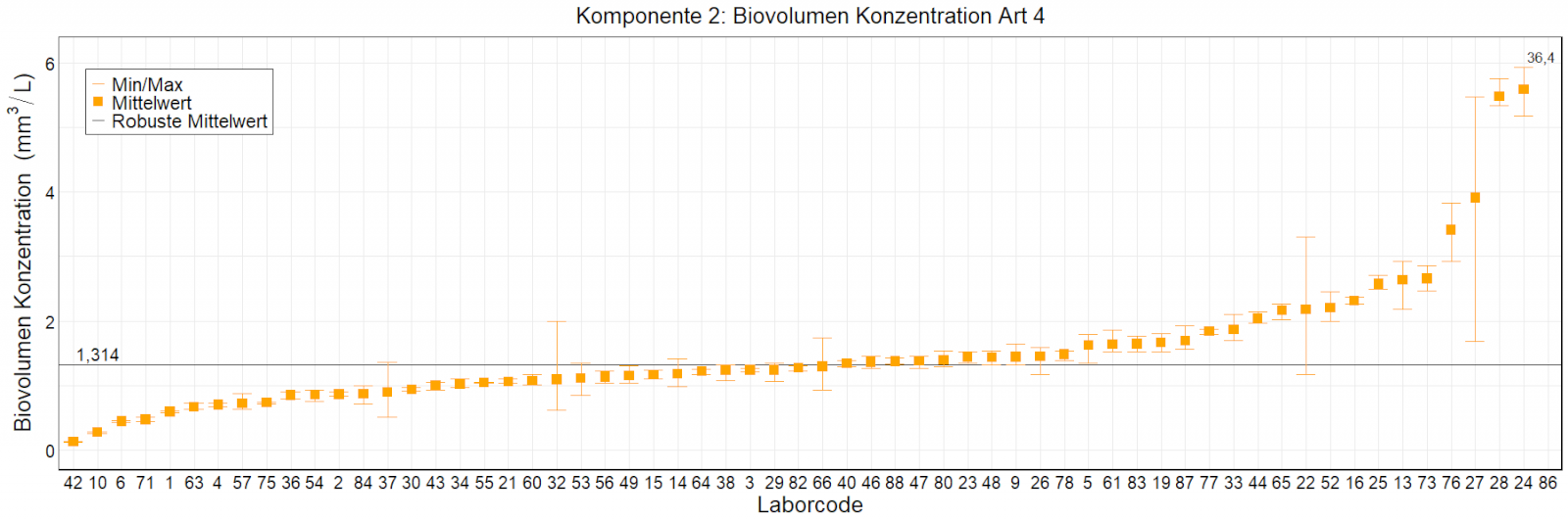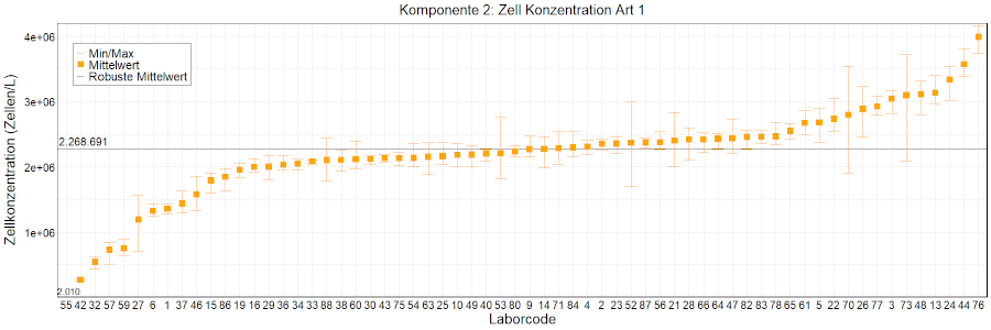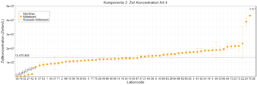 In den Abbildungen sind die mittleren Ergebnisse für jedes Labor als kleiner, orangefarbener Kasten dargestellt. Die Whisker reichen bis zu den Minimum- und Maximumwerten. Der robuste Mittelwert, der auf dem ungefilterten Datensatz basiert, wird als fette schwarze Linie dargestellt. Mittlere Laborergebnisse, die außerhalb der Skala liegen, wurden als Zahlen eingetragen.