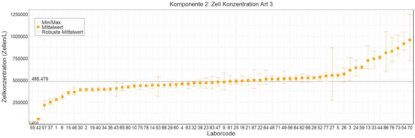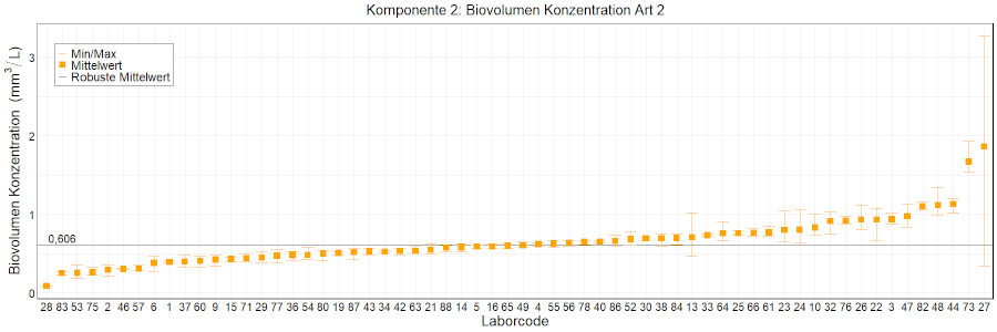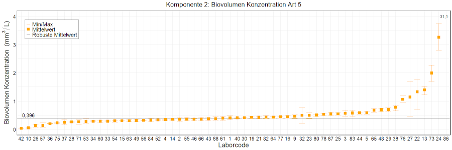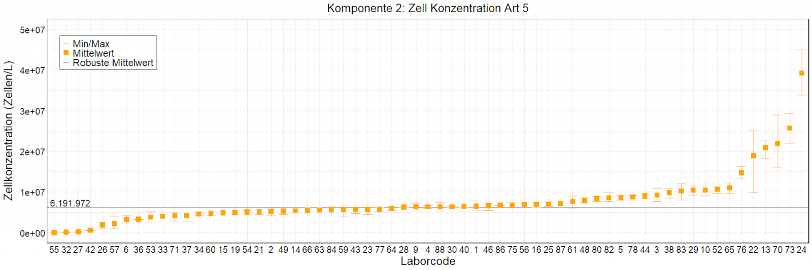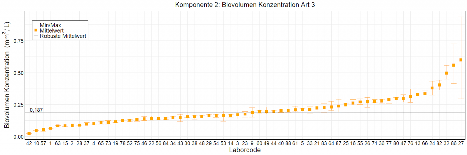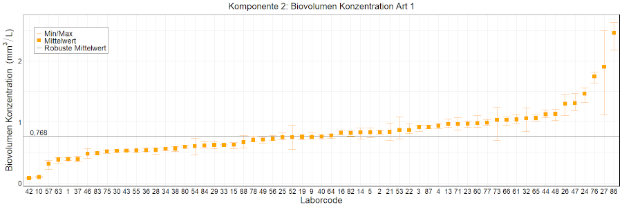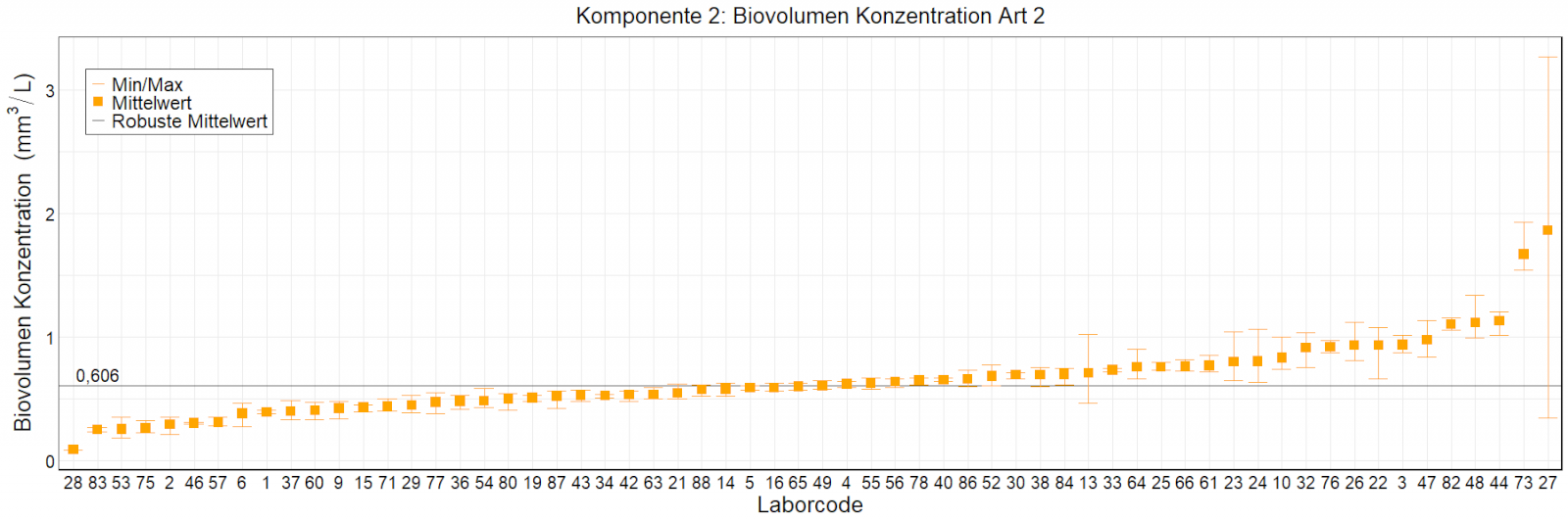 In den Abbildungen sind die mittleren Ergebnisse für jedes Labor als kleiner, orangefarbener Kasten dargestellt. Die Whisker reichen bis zu den Minimum- und Maximumwerten. Der robuste Mittelwert, der auf dem ungefilterten Datensatz basiert, wird als fette schwarze Linie dargestellt. Mittlere Laborergebnisse, die außerhalb der Skala liegen, wurden als Zahlen eingetragen.